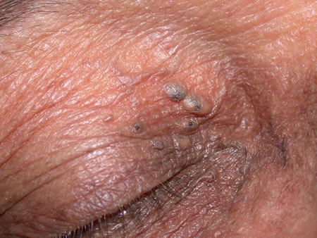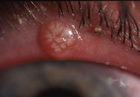 Many non-inflammatory benign lumps and cysts may occur around the eyelids. All are typically slow-growing, persistent, painless and do not damage adjacent tissues. Many derive from the local structures of the lids ie skin (papilloma, seborrhoeic keratosis), sweat glands (cyst of Moll, benign tumour), sebaceous glands (cyst of Zeis, sebaceous cyst, chalazion, milia), pigment cells (melanocytic naevus), hair follicles (benign tumour), blood vessels (vascular naevus). Molluscum infection also produces a non-inflammed lump though there may be associated conjunctivitis.